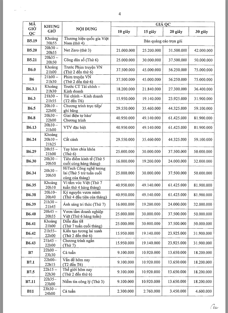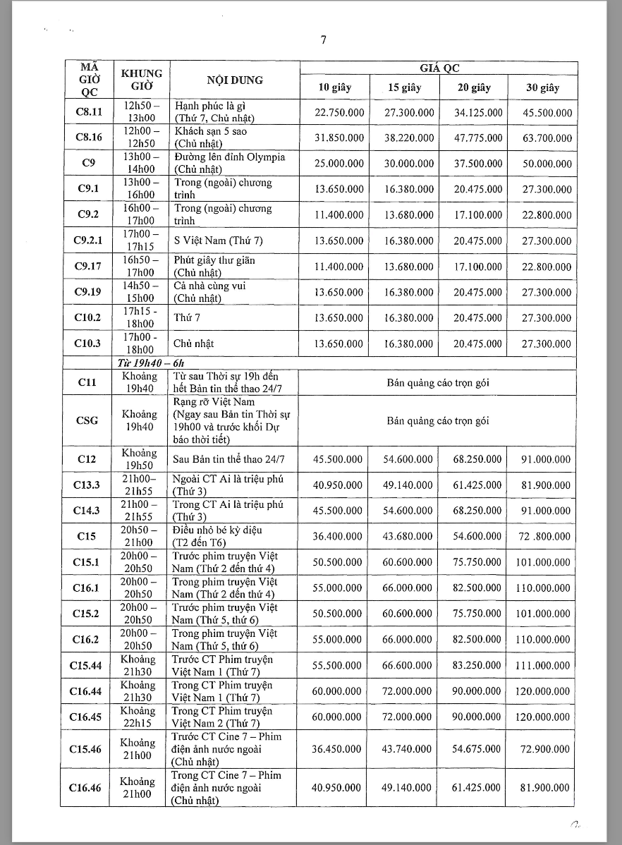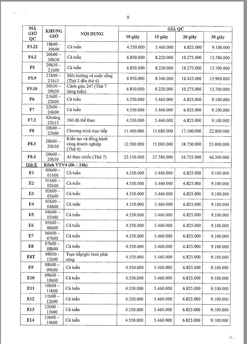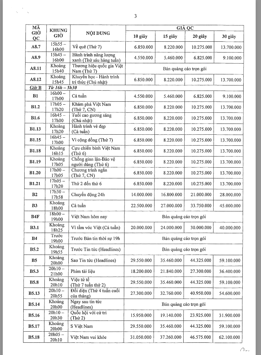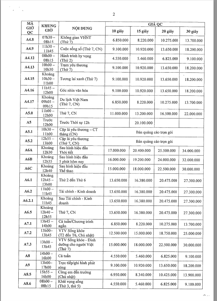 Các khung giờ phát sóng đa dạng từ sáng sớm (5h30) đến khung giờ vàng, bao gồm các chương trình tin tức, tài chính, đời sống và giải trí – phù hợp với từng nhóm khách hàng mục tiêu. Theo bảng giá chính thức, chi phí TVC dao động từ khoảng 4,5 triệu đến hơn 36 triệu/spot 30 giây tùy khung giờ và nội dung chương trình.