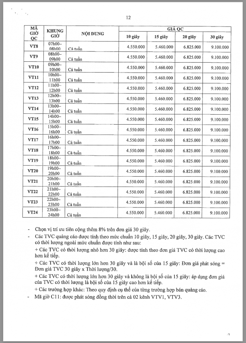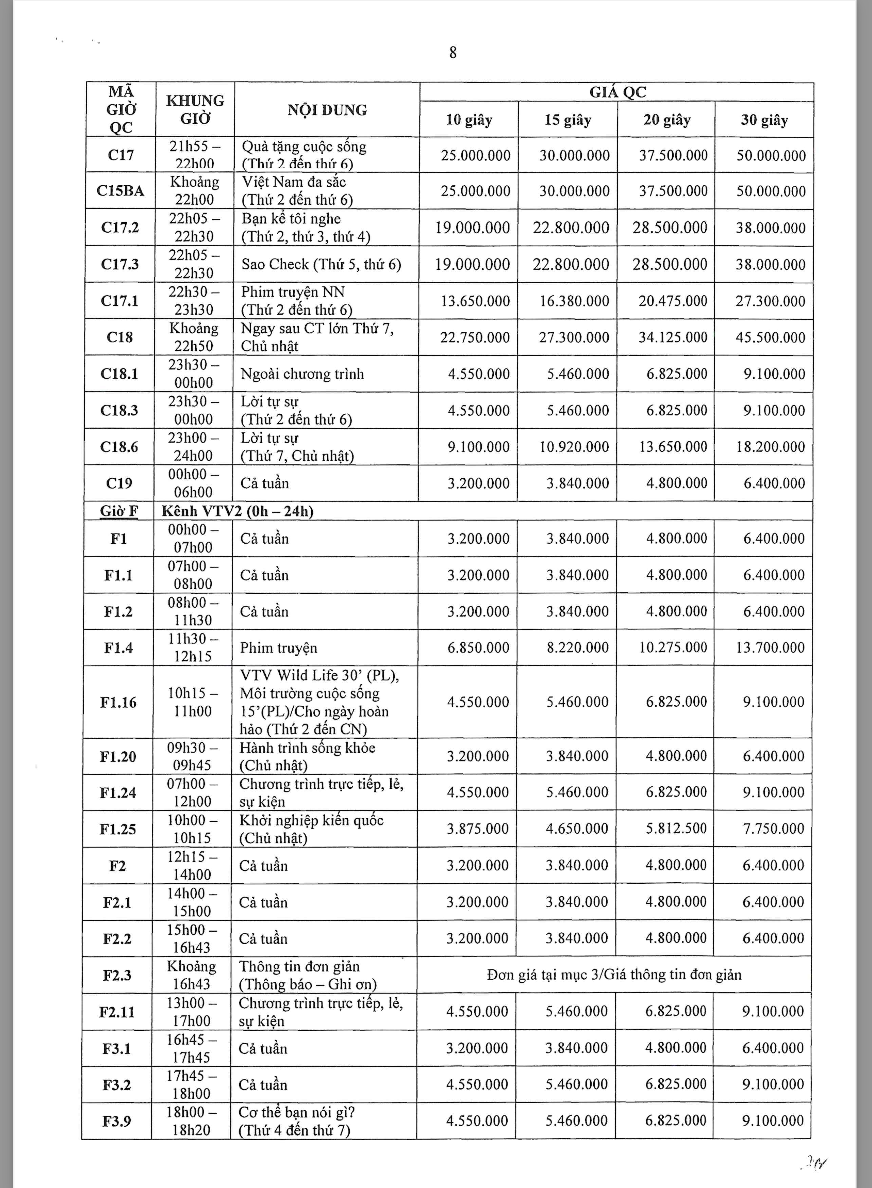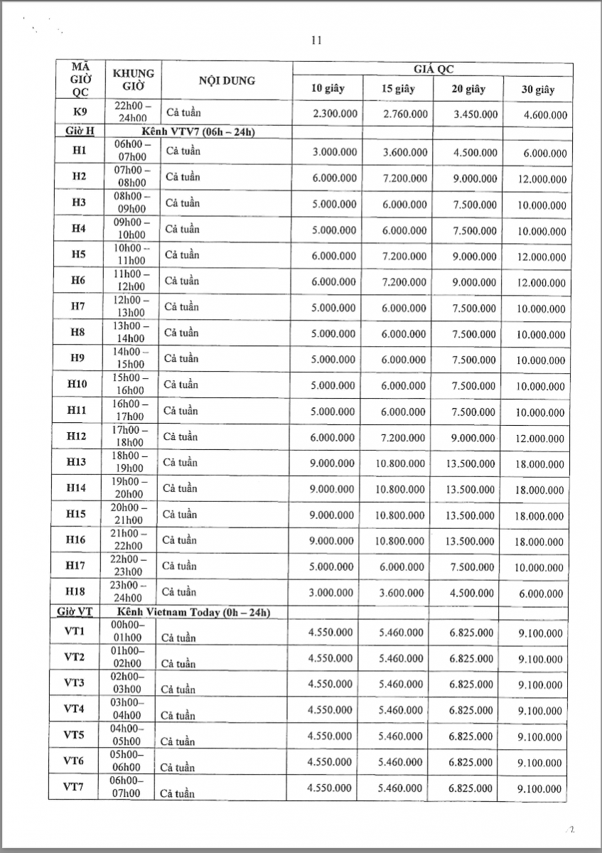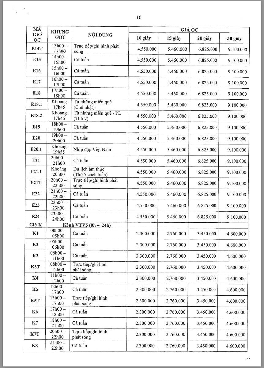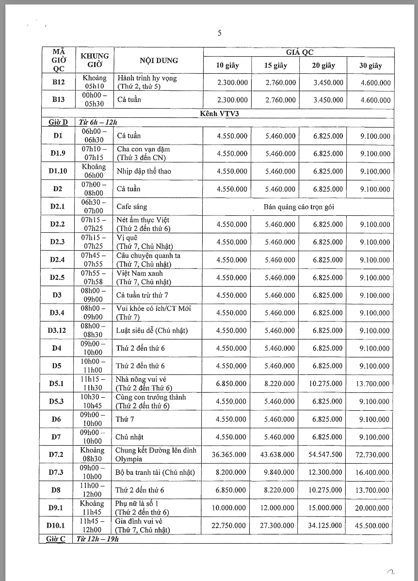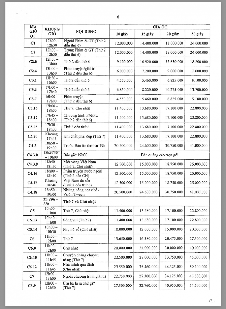 Các khung giờ phát sóng đa dạng từ sáng sớm (5h30) đến khung giờ vàng, bao gồm các chương trình tin tức, tài chính, đời sống và giải trí – phù hợp với từng nhóm khách hàng mục tiêu. Theo bảng giá chính thức, chi phí TVC dao động từ khoảng 4,5 triệu đến hơn 36 triệu/spot 30 giây tùy khung giờ và nội dung chương trình.