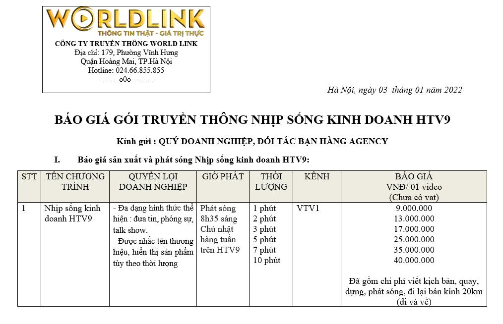 - Bảng báo giá quảng cáo trong chương trình Nhịp sống kinh doanh HTV9 giá cạnh tranh toàn quốc, xem tại đây: