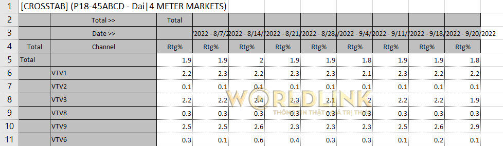 Rating kênh VTV - Đài truyền hình Việt Nam (0.1 tương đương với 1.500.000 người xem)