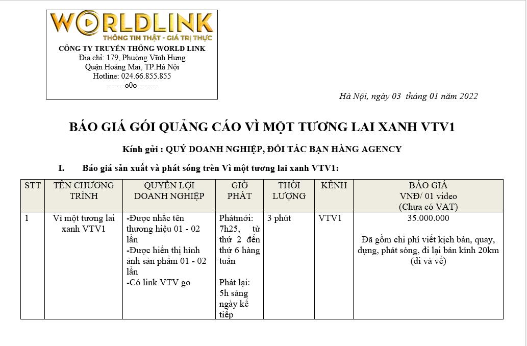- Báo giá sản xuất video quảng cáo sản phẩm trên chương trình Vì một tương lai xanh - VTV1 giá cạnh tranh, xem tại đây: