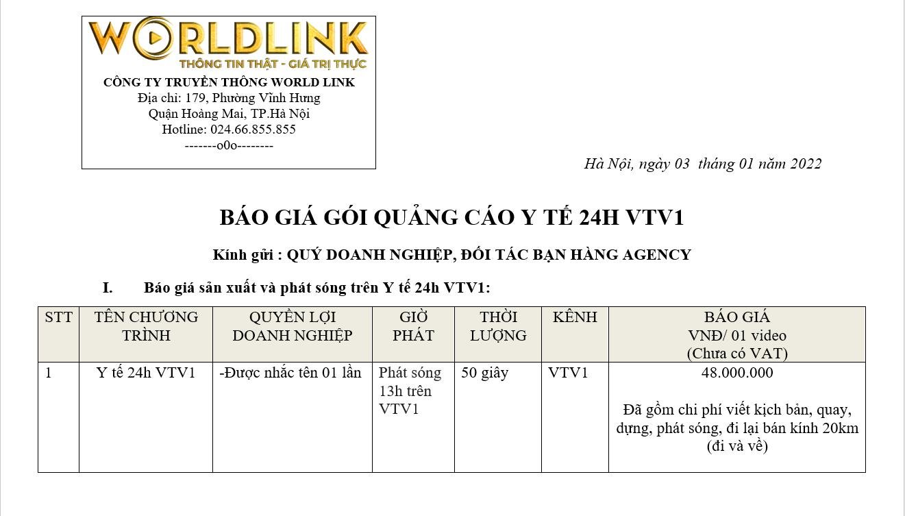 Bảng cáo giá dịch vụ Booking truyền hình bản tin Y tế 24H